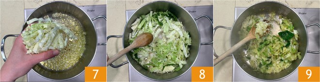 Wenn die Zwiebel goldbraun ist, fügen Sie die Wirsingstreifen hinzu 7 und dünsten Sie sie bei mittlerer bis hoher Hitze einige Minuten 8. Sobald sie weich sind, nehmen Sie den Wirsing aus dem Topf 9 und stellen ihn beiseite.