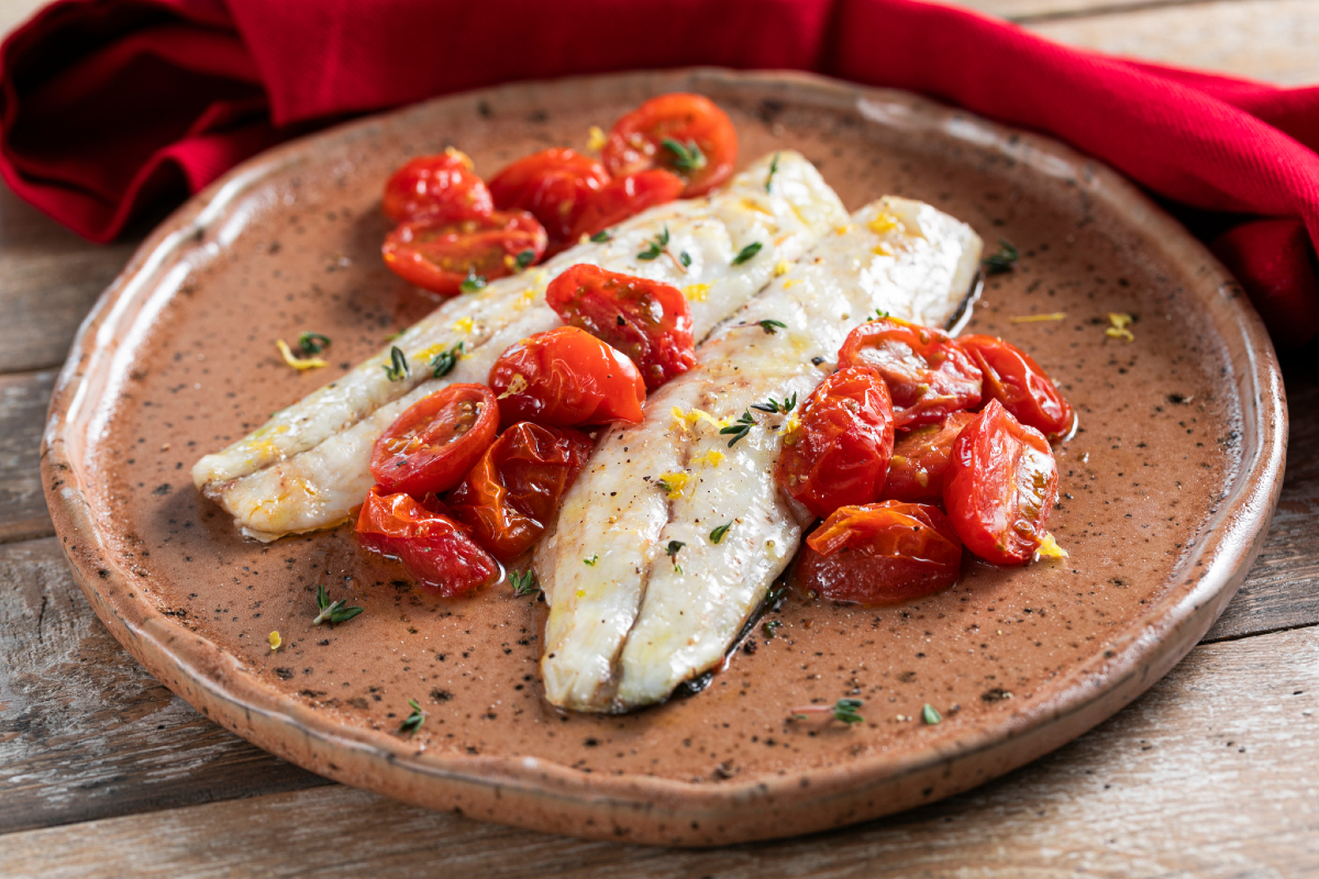 Dazu passen Datterini-Kirschtomaten. Klein, süß und intensiv – beim Garen verwandeln sie sich in eine saftige, aromatische Beilage. Das Gleichgewicht aus Säure und Muscovado-Zucker bildet einen perfekten Kontrast zur Zartheit des Fisches und verleiht dem Gericht eine lebendige, mediterrane Note.