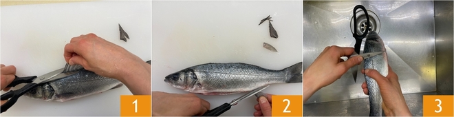 Zur Vorbereitung des Wolfsbarsches in der Heißluftfritteuse beginnen Sie mit der Wie man den Wolfsbarsch reinigt. Schneiden Sie die Seitenflossen 1 und die Rückenflossen 2 ab, schneiden Sie den Bauch auf, entfernen Sie die Eingeweide und nehmen Sie die Schuppen unter fließendem Wasser ab 3.
