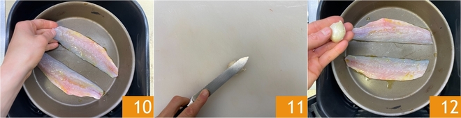 Besorgen Sie eine Backform, die in Ihre Heißluftfritteuse (mit einem Fassungsvermögen von 6 L) passt, und legen Sie jeweils 2 gewürzte Filets hinein, oder mehr, je nach Größe Ihres Frittierkorbs 10. Drücken Sie eine Knoblauchzehe 11 und geben Sie sie in die Form 12.