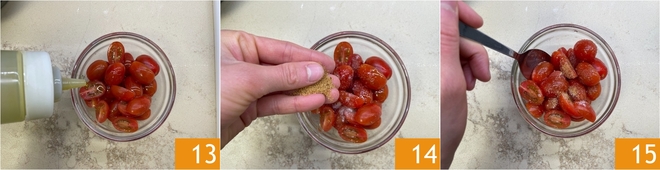 Schneiden Sie die Datterini-Kirschtomaten und marinieren Sie sie in einer Schüssel mit extra nativem Olivenöl 13, Salz und Muscovado-Zucker 14. Vermengen Sie alles gut, damit sich die Zutaten verbinden 15.