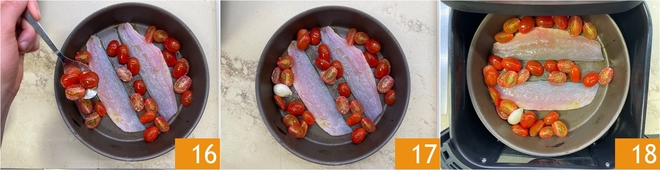 Geben Sie ein Viertel der Tomaten in die Form 16, dabei darauf achten, sie nicht auf den Filets zu stapeln 17. Stellen Sie nun die Temperatur der Heißluftfritteuse auf 170 °C ein und schieben Sie den Korb ein 18.