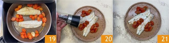 Garen Sie 7 Minuten 19 oder so lange, bis der Wolfsbarsch durchgegart und die Tomaten saftig sind 19. Kurz vor dem Servieren mit schwarzem Pfeffer würzen 20. Der Wolfsbarsch aus der Heißluftfritteuse ist servierbereit 21.