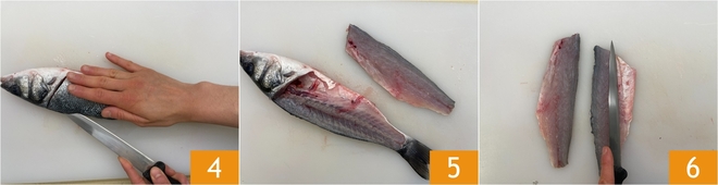 Nun schneiden Sie mit einem scharfen Messer längs am Rücken des Wolfsbarsches 4 – so erhalten Sie das erste Filet 5. Filetieren Sie auch das andere Stück und entfernen Sie die fetteren Partien 6, dabei die Haut erhalten.
