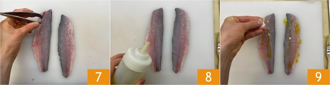 Mit einer Küchenzange stellen Sie sicher, dass alle Gräten aus dem Filet entfernt sind 7. Würzen Sie mit extra nativem Olivenöl 8 und einer Prise Salz 9. Aus 4 Wolfsbarschen erhalten Sie 2 Filets pro Portion.