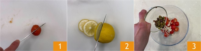 Um den Wolfsbarsch in der Folie zuzubereiten, waschen und halbieren Sie die Kirschtomaten 1. Schneiden Sie die Zitrone in Scheiben 2. Sammeln Sie die Kirschtomaten, Pinienkerne und Oliven in einer Schüssel 3.
