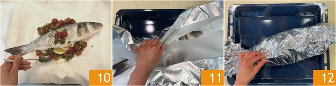 Legen Sie ein Blatt Aluminiumfolie auf eine ebene Fläche und darauf ein weiteres aus Backpapier. Legen Sie hier den Wolfsbarsch ab und verteilen Sie die Kirschtomaten an den Seiten 10. Schließen Sie die beiden Blätter 11 übereinander 12, und achten Sie darauf, die Seiten gut zu versiegeln. Backen Sie im vorgeheizten statischen Ofen bei 170 Grad für 30/35 Minuten.