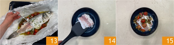 Wenn es gekocht ist, nehmen Sie die Folie aus dem Ofen, öffnen Sie sie und reinigen Sie den noch warmen Fisch. Nehmen Sie mit einer Gabel ein Stück Haut und ziehen Sie es ab 13. Servieren Sie die Wolfsbarschfilets in der Folie noch heiß 14 zusammen mit der Würze aus Kirschtomaten, Pinienkernen und Oliven 15.
