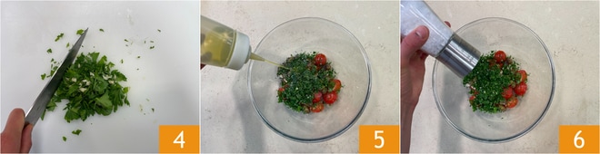 Hacken Sie die Petersilie und den zuvor geschälten Knoblauch 4 und fügen Sie sie den Kirschtomaten hinzu. Würzen Sie mit Öl 5, Salz 6 und Pfeffer.