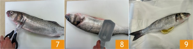 Reinigen Sie nun den Fisch, indem Sie die Flossen abschneiden 7 und ihn mit dem entsprechenden Werkzeug entschuppen 8. Dann, nachdem Sie ihn ausgeweidet und innen und außen unter fließendem Wasser gespült haben, füllen Sie das Innere mit den Zitronenscheiben 9.