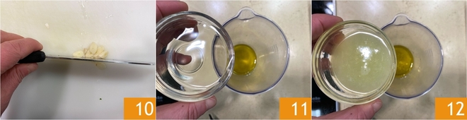 Schälen und hacken Sie auch die Knoblauchzehe fein 10. In einem Messbecher geben Sie das native Olivenöl extra, den weißen Weinessig 11 und den Zitronensaft 12.