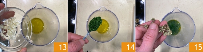 Fügen Sie den gehackten Knoblauch 13, die fein gehackte Petersilie 14 und den getrockneten Oregano 15 hinzu.