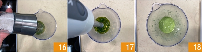 Geben Sie das Salz hinzu 16 und mixen Sie alles mit einem Stabmixer 17, bis Sie eine cremige und homogene grüne Sauce erhalten 18.