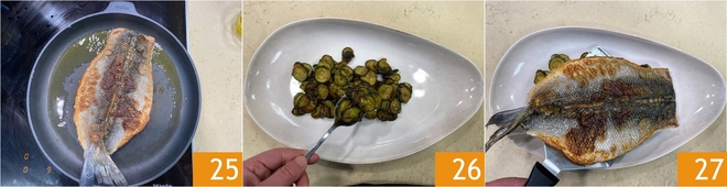 Lassen Sie ihn kochen, bis Sie eine knusprige Goldbräune erreichen, drehen Sie dann den Wolfsbarsch um, schalten Sie die Hitze aus und lassen Sie ihn noch 5 Minuten weitergaren 25, um eine sanfte Garung zu gewährleisten. Stellen Sie das Gericht zusammen: Legen Sie die sautierten Zucchini auf den Boden des Serviertellers 26 und legen Sie den gut gebräunten Wolfsbarsch darüber 27.