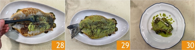 Bestreichen Sie die Oberfläche des Fisches großzügig mit der Sauce 28, sodass er gleichmäßig bedeckt ist 29, garnieren Sie mit Thymianblättern. Der Wolfsbarsch in der Pfanne mit sautierten Zucchini ist servierfertig 30.