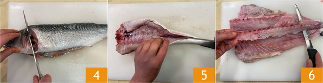 Schneiden Sie den Kopf ab 4 und öffnen Sie den Fisch wie ein Buch 5, indem Sie das Messer entlang der Mittellinie führen, dann vorsichtig die Wirbelsäule und die Hauptgräten entfernen 6.