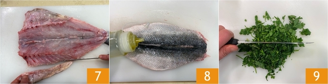 Schneiden Sie das Filet zu, indem Sie den dünnsten und fettesten Teil des Bauches entfernen 7, um eine gleichmäßige Oberfläche zu erhalten. Würzen Sie nun den geöffneten Wolfsbarsch mit einem Schuss Öl 9 und Salz. Stellen Sie ihn beiseite, während Sie die Sauce zubereiten. Hacken Sie die Petersilie fein 9.