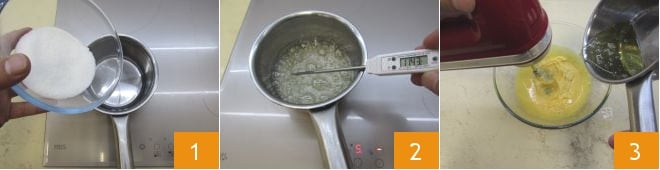Um den Woodland-Kuchen aus Panettone zuzubereiten, beginnen Sie mit der Mascarpone-Creme. Gießen Sie Wasser und Zucker 1 in einen Topf, mischen Sie und erhitzen Sie die Mischung auf 121°C: Für diesen Vorgang ist ein Zuckerthermometer unerlässlich 2. Wenn die Mischung 115°C erreicht hat, geben Sie die Eigelbe in eine Schüssel und beginnen Sie, sie mit einem elektrischen Schneebesen aufzuschlagen. Sobald die Temperatur erreicht ist, gießen Sie den Sirup in einem dünnen Strahl bei laufendem Schneebesen hinzu 3.