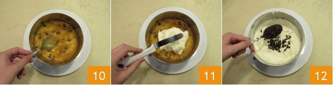 Verteilen Sie eine dicke Schicht Orangenmarmelade 10 und dann eine reichhaltige Schicht Creme und verteilen Sie sie gleichmäßig mit einem Spatel 11. Schließen Sie die erste Schicht mit Schokoladenraspeln ab 12.