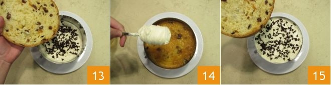 Und beginnen Sie an dieser Stelle von vorne mit Panettone 13, Marmelade, Creme 14 und schließlich Raspeln. Auf der letzten Schicht Panettone 15.
