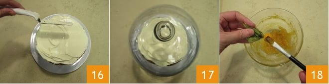 geben Sie noch etwas Marmelade darauf und dann die restliche Creme und streichen Sie sie glatt 16. Dann decken Sie den Kuchen mit einer Glasglocke ab und lassen ihn im Kühlschrank für mindestens eine Stunde fest werden 17. In der Zwischenzeit können Sie die Dekorationen vorbereiten. Binden Sie die Zimtstangen, am besten die kleinen, mit Lebensmittelschnur zusammen. Spülen und trocknen Sie die Myrtenzweige. Denken Sie schließlich daran, auch die Tierfiguren zu reinigen, die zur Dekoration verwendet werden. Zuletzt die Physalis, bestreichen Sie sie mit etwas Marmelade 18.