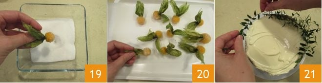 Wälzen Sie sie dann im Zucker 19 und legen Sie sie nach und nach auf ein mit Backpapier ausgelegtes Tablett 20. Nach der Ruhezeit nehmen Sie den Kuchen aus dem Kühlschrank und entfernen den Ring. Dekorieren Sie den Kuchen abschließend, indem Sie mit der Myrte beginnen, die halbmondförmig auf der Oberfläche verteilt wird 21.