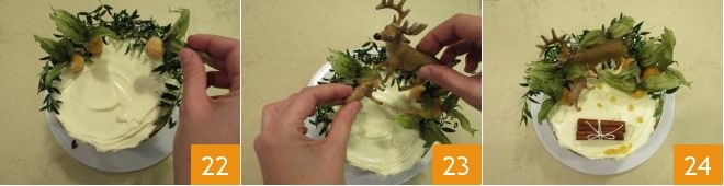 Fügen Sie dann die gezuckerten Physalis 22, das Reh und das Rehkitz 23 hinzu und beenden Sie mit dem Gebinde aus Zimtstangen. Bestäuben Sie alles mit etwas Schnee (Puderzucker, versteht sich) und Ihr wunderschöner Woodland-Kuchen aus Panettone ist fertig 24.
