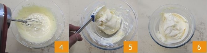 Schlagen Sie weiter, bis die Mischung auf Raumtemperatur abgekühlt ist 4. Schalten Sie den Schneebesen aus und arbeiten Sie mit einem Spatel den Mascarpone durch, um ihn glatt zu rühren, bevor Sie die Eicreme hinzufügen 5. Decken Sie die Mascarpone-Creme mit Frischhaltefolie ab und lassen Sie sie mindestens 30 Minuten im Kühlschrank fest werden 6.