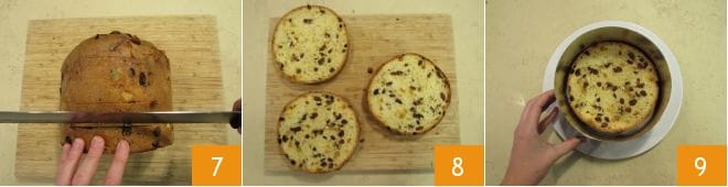 In der Zwischenzeit kümmern Sie sich um den Panettone. Wir haben einen Panettone mit 18 cm Durchmesser gewählt, um möglichst wenig Verschnitt zu haben, da die Kuppel entfernt wird (um sie wiederzuverwenden, können Sie leckere Cake Pops zubereiten). Fahren Sie dann mit dem Schneiden mit einem gezackten Messer fort: Schneiden Sie zunächst oberflächlich Linien in Abständen von 3 cm um den Panettone herum, die beim Schneiden als Orientierung dienen. Danach schneiden Sie entlang dieser Linien, genau wie beim Biskuitkuchen 7: So erhalten Sie 3 gleichmäßige Scheiben 8. Um saubere und präzise Ergebnisse zu erzielen, legen Sie die Basis des Panettone in einen Backring auf einem Teller 9.