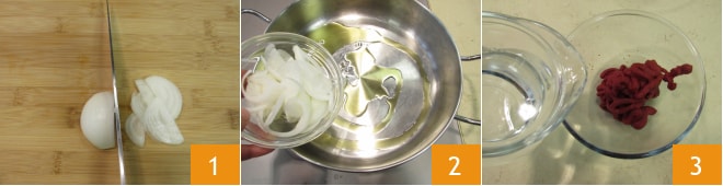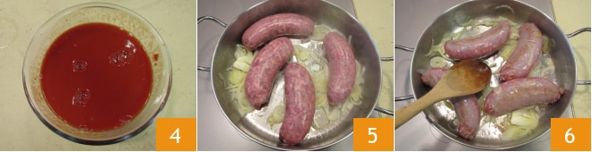 Um die Würstchen in Soße zuzubereiten, beginnen Sie mit den Zwiebeln. Nachdem Sie sie geschält haben, schneiden Sie sie fein 1. Geben Sie die dünnen Streifen in eine Pfanne mit etwas Öl und lassen Sie sie bei schwacher Hitze einige Minuten anbraten 2. In der Zwischenzeit das Wasser auf das Tomatenmark geben 3