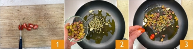 Um die würzigen Hähnchenschnitzel zuzubereiten, wasche zuerst die Tomaten und halbiere sie 1. In einer großen Pfanne gib einen Schuss Öl, 2 Knoblauchzehen, die Kapern und die Oliven hinzu 2. Stelle die Pfanne auf den Herd und lege die Tomaten mit der Schnittfläche nach unten in die Pfanne 3.