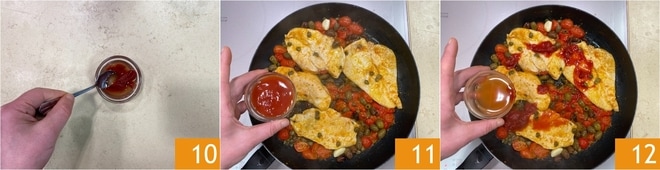 In der Zwischenzeit löse die Tomatenmark in wenig Wasser auf 10. Gib es in die Pfanne 11 und füge das restliche Wasser hinzu, um die Schüssel gut zu reinigen 12.