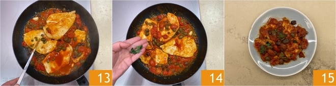 Rühre gut um 13 und koche noch ein paar Minuten weiter. Füge dann die frischen Oregano-Blätter hinzu 14, nur eine Prise Salz, Pfeffer und serviere deine Schnitzel heiß 15.