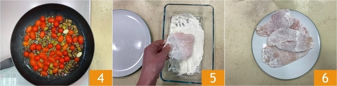 Lasse sie bei mittlerer bis hoher Hitze etwa 5 Minuten kochen 4. Überprüfe in der Zwischenzeit, ob die Hähnchenscheiben dünn sind, ansonsten klopfe sie mit einem Fleischklopfer. Mehle die Hähnchenbrustscheiben auf allen Seiten 5, schüttle den Überschuss ab und lege sie nach und nach auf einen Teller 6.