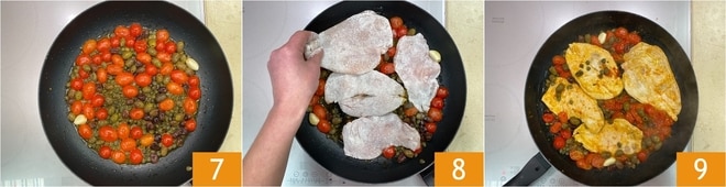 Wenn die Tomaten gut angebraten sind 7, lege die Hähnchenbrustscheiben in die Pfanne 8. Brate sie ein paar Minuten an, drehe sie dann mit einer Zange um und brate sie auch auf der anderen Seite an 9.
