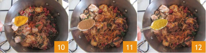 Fügen Sie auch Kurkuma 10, Zimt 11 und Curry hinzu 12.