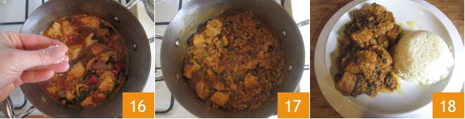 Salzen Sie 16 und kochen Sie es bei niedriger Hitze für etwa eine Stunde: Die Konsistenz sollte saftig, aber nicht flüssig sein 17. Servieren Sie Ihr würziges Schweinegulasch mit Linsen zusammen mit Basmati-Reis 18!
