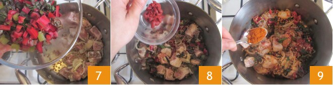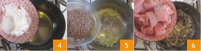 Geben Sie einen Schuss Öl in einen Schmortopf, fügen Sie die Zwiebeln hinzu 4 und braten Sie sie bei niedriger Hitze an, bis sie weich sind, dabei oft umrühren. Fügen Sie nun die Linsen hinzu 5 und rösten Sie sie für ein paar Sekunden, dann geben Sie die Fleischwürfel hinzu 6 und braten Sie sie von allen Seiten an.