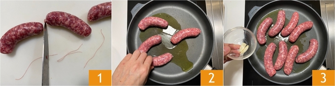Um die Bratwurst in der Pfanne zuzubereiten, entfernen Sie zuerst den Bindefaden, der die Würste verbindet 1, und lassen den Darm dran, damit sie ihre Form behalten. Erhitzen Sie etwas Öl in einer großen beschichteten Pfanne, legen Sie dann die Würste hinein 2 und fügen die Knoblauchzehen hinzu 3.