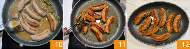 Während des Garens gelegentlich umrühren, damit die Farbe gleichmäßig wird 10. Sobald sie fertig sind, entfernen Sie die Kräuter 11. Servieren Sie die Bratwurst in der Pfanne sofort und garnieren Sie sie mit ein paar Rosmarinzweigen und einigen Salbeiblättern 12!