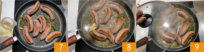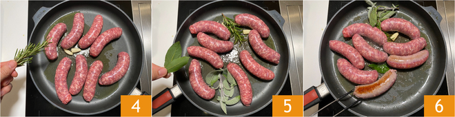 Würzen Sie mit Rosmarin 4, Salbei und Lorbeer 5. Braten Sie die Würste bei mittelhoher Hitze an, bis sie goldbraun sind, dann drehen Sie sie auf die andere Seite 6; insgesamt dauert das etwa 6 Minuten.