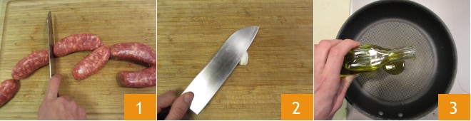 Um die Wurst in der Pfanne zuzubereiten, beginnen Sie damit, die Würste einzeln zu trennen, falls sie mit einem Faden verbunden sind 1. Drücken Sie eine geschälte Knoblauchzehe unter der Rückseite einer Klinge 2 und begeben Sie sich zum Herd. Geben Sie ein wenig Öl in eine Pfanne 3,