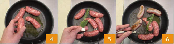 legen Sie die Würste hinein 4 und fügen Sie auch den Knoblauch zusammen mit dem Rosmarinzweig und dem Lorbeerblatt hinzu 5. Lassen Sie es etwa 10 Minuten bei starker Hitze braten und rühren Sie, sobald die verschiedenen Seiten ein wenig gebräunt sind 6.