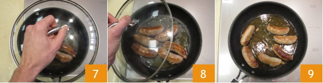 Entfernen Sie die Gewürze, reduzieren Sie die Hitze und decken Sie mit dem Deckel ab 7, dann lassen Sie es weitere zehn Minuten kochen, indem Sie die Pfanne gelegentlich schütteln 8. Ihre heiße Wurst in der Pfanne ist fertig, garniert mit frischen Kräutern, guten Appetit 9.