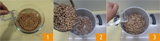 Um Wurst und Bohnen zuzubereiten, beginnen Sie damit, die Borlotti-Bohnen für 8 Stunden einzuweichen 1. Am nächsten Tag die Bohnen abtropfen lassen, abspülen und in einen großen Topf geben 2, mit kaltem Wasser bedecken 3 und zum Kochen bringen. Sobald das Wasser heiß ist, die Hitze reduzieren und alles etwa 50 Minuten köcheln lassen; erst am Ende der Garzeit salzen.