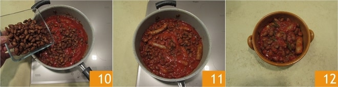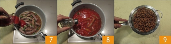 Die Rosmarinzweige und das Tomatenpüree hinzufügen 7. Mit Salz und Pfeffer 8 würzen und 35-40 Minuten bei niedriger Hitze kochen lassen. Nach der angegebenen Zeit die gekochten Bohnen abtropfen lassen 9.