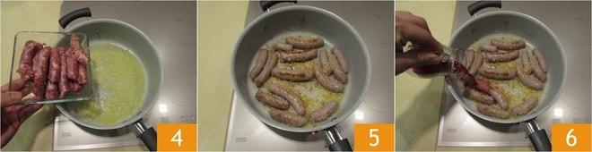 In der Zwischenzeit eine Zwiebel schälen und fein hacken, dann zusammen mit dem Öl in eine Pfanne geben und 6-7 Minuten bei niedriger Hitze anbraten. Dann die Würstchen hinzufügen 4 und 3-4 Minuten anbraten, dabei gelegentlich umrühren, damit der Boden nicht anbrennt 5. Mit dem Wein ablöschen 6, bis der Alkohol vollständig verdampft ist.