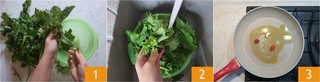 Um Wurst und Stängelkohl zuzubereiten, beginnen Sie damit, letztere zu putzen: Halten Sie die Stiele mit den kleineren Blättern und den Blütenständen beiseite, stellen Sie sicher, dass keine vergilbten Teile an den größeren Blättern vorhanden sind, diese werden entfernt. Ziehen Sie die gesunden Blätter von den Stielen, indem Sie mit einer Hand den Stiel halten und die Seite mit den Blättern abziehen 1. Waschen Sie die Stängelkohl gründlich unter fließendem Wasser 2. Geben Sie etwas Öl, Knoblauch und die in zwei Hälften geschnittene Chilischote in eine Pfanne 3,