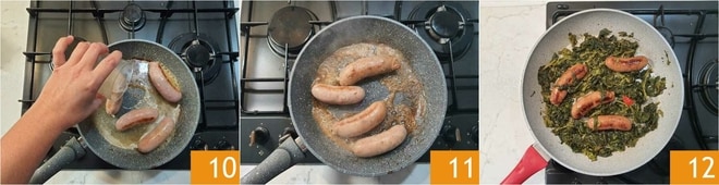 und geben Sie den Weißwein hinzu 10. Lassen Sie den Wein verdampfen und trocknen Sie ihn, dann beenden Sie das Garen der Würste in der Pfanne, bis sie goldbraun sind: Sie können, wenn Sie möchten, einen Schuss Öl hinzufügen 11. Sobald die Würste schön angebraten sind, geben Sie sie in die Pfanne mit den Stängelkohl. Stellen Sie die Pfanne wieder auf den Herd und lassen Sie alles fünf Minuten lang ziehen. Servieren Sie Wurst und Stängelkohl, indem Sie alles schön heiß genießen 12.