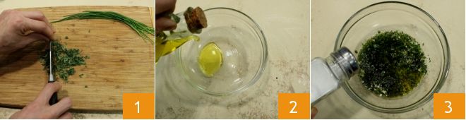 Um die würzige Pilzpfanne zuzubereiten, beginnt ihr mit dem Kräuterhack, das zum Würzen dient: Hackt die Petersilie 1, den Schnittlauch, den Oregano, die Knoblauchzehe. Dann gebt ihr einen Schuss Öl in eine kleine Schüssel 2, fügt das gehackte Kräuter hinzu und salzt 3 und pfeffert nach Belieben.